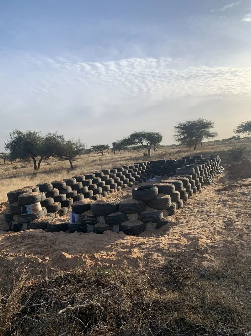 À quelques dizaines de mètres du champ de Mamy Diop, des jeunes habillés de gilets fluorescents s’affairent autour d’un grand cratère. Le grand trou sert de fondation à ce qui sera bientôt un hangar écologique. Sur les parois, des pneus usagés sont installés. Des bouteilles remplies de sable servent de joints aux pneus qui forment les murs. Cette première structure, qui va se retrouver sous terre, sert de fondation à ce hangar écologique.