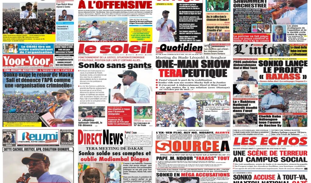 Les quotiens de ce 10 novembre avec (Mamadou Ly, ma revue de presse) Sénégal: Sonko en offensive, les lionceaux rugissent Bonjour et bienvenue dans votre revue de presse de ce