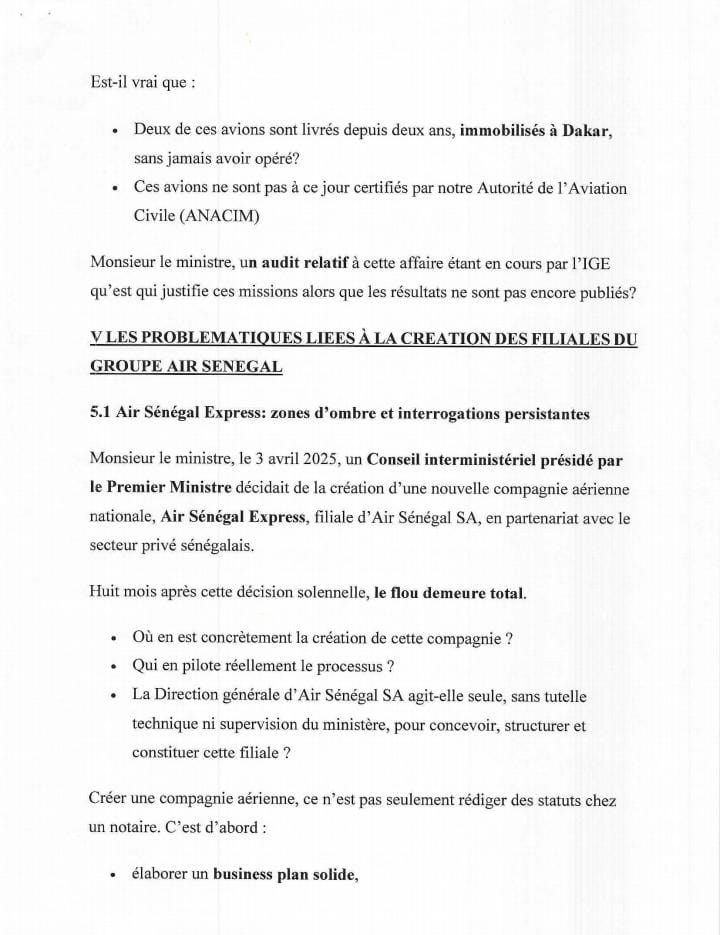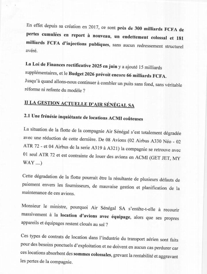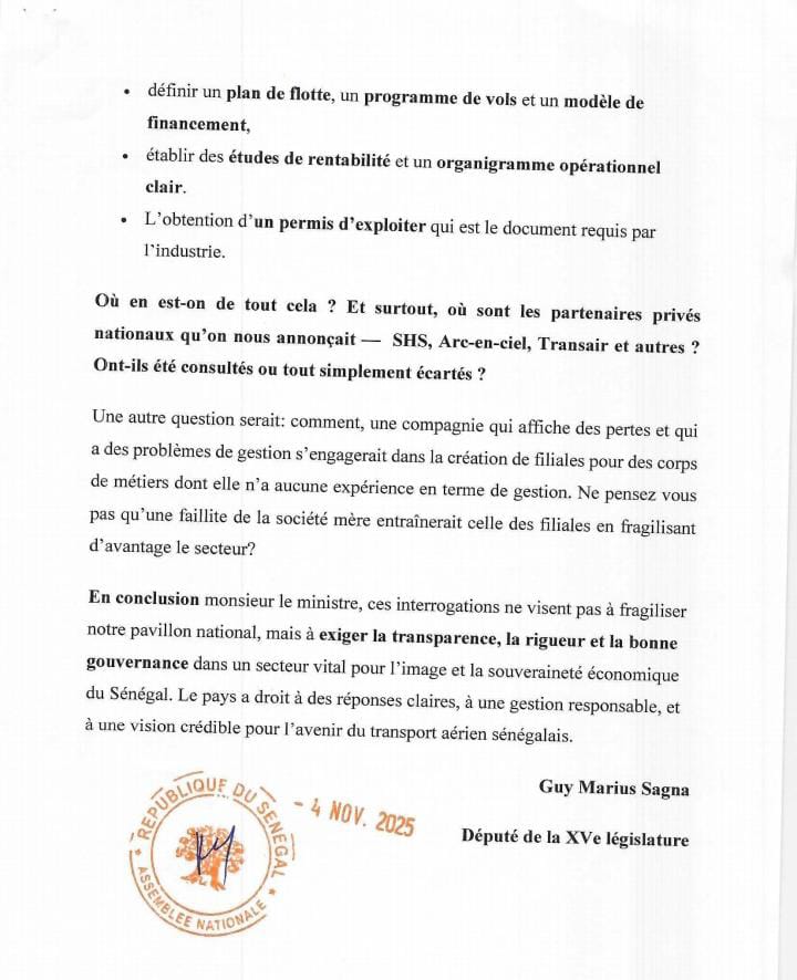 Le député conclut en s’interrogeant sur la nécessité de continuer à injecter des fonds publics au regard de ces défaillances de gouvernance et des 250 milliards de FCFA de pertes cumulées entre 2020 et 2024. Il demande également des précisions sur l’avancement de la création de la filiale Air Sénégal Express et l’association des partenaires privés nationaux annoncés.