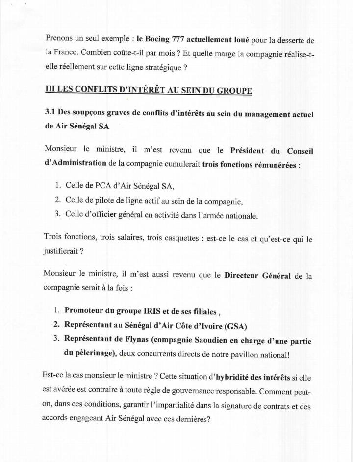 - Le DG au service de la concurrence ? Plus critique encore, le député demande si le Directeur Général (DG) est également le représentant (GSA) d’Air Côte d’Ivoire et de Flynas au Sénégal – deux concurrents directs d’Air Sénégal. S’ajoute à cela le rôle de promoteur du Groupe IRIS et de ses filiales. Si ces faits sont confirmés, le DG serait dans une situation de conflit d’intérêts frontal, impossible à concilier avec la défense des intérêts de la compagnie nationale.
