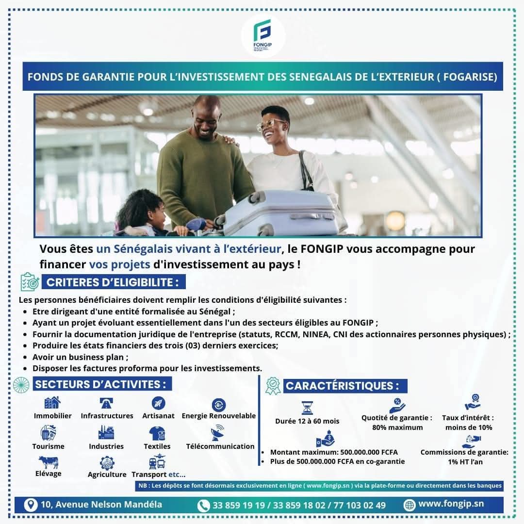 Le Fonds de Garantie des Investissements Prioritaires (FONGIP) réaffirme son engagement auprès des Sénégalais de l’extérieur en leur offrant un accompagnement sur mesure pour sécuriser leurs projets d’investissements au pays. Avec le dispositif innovant FOGARISE, le FONGIP encourage la diaspora à faire du Sénégal la terre de leurs réussites économiques.