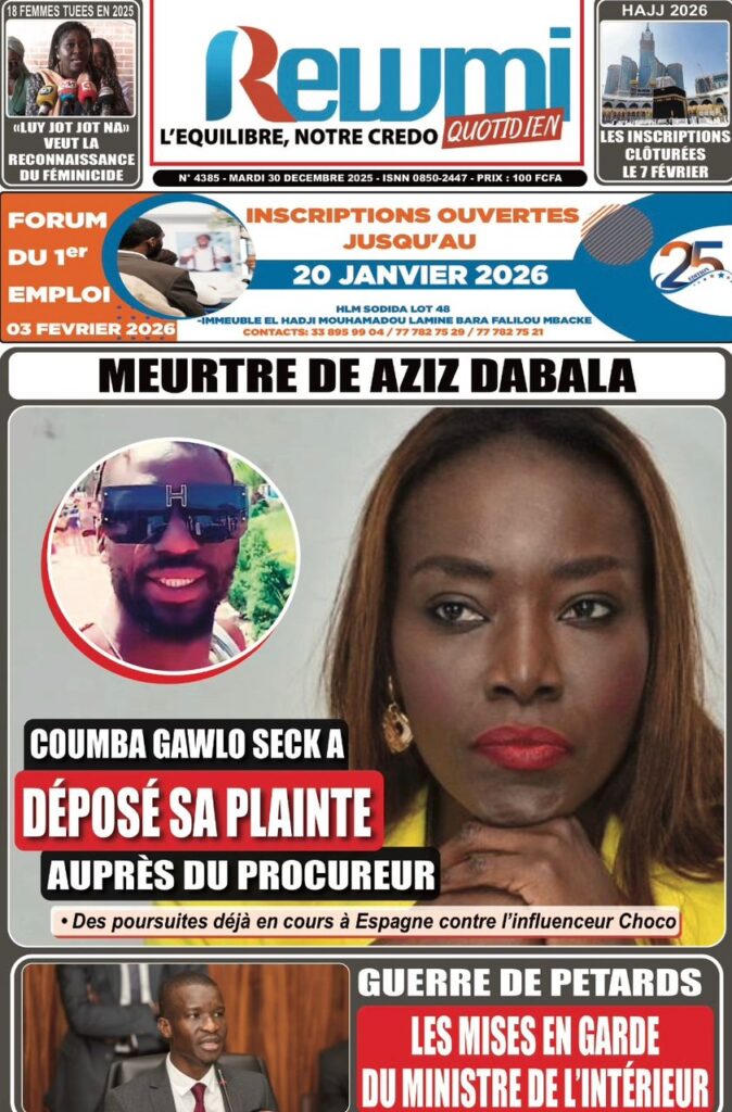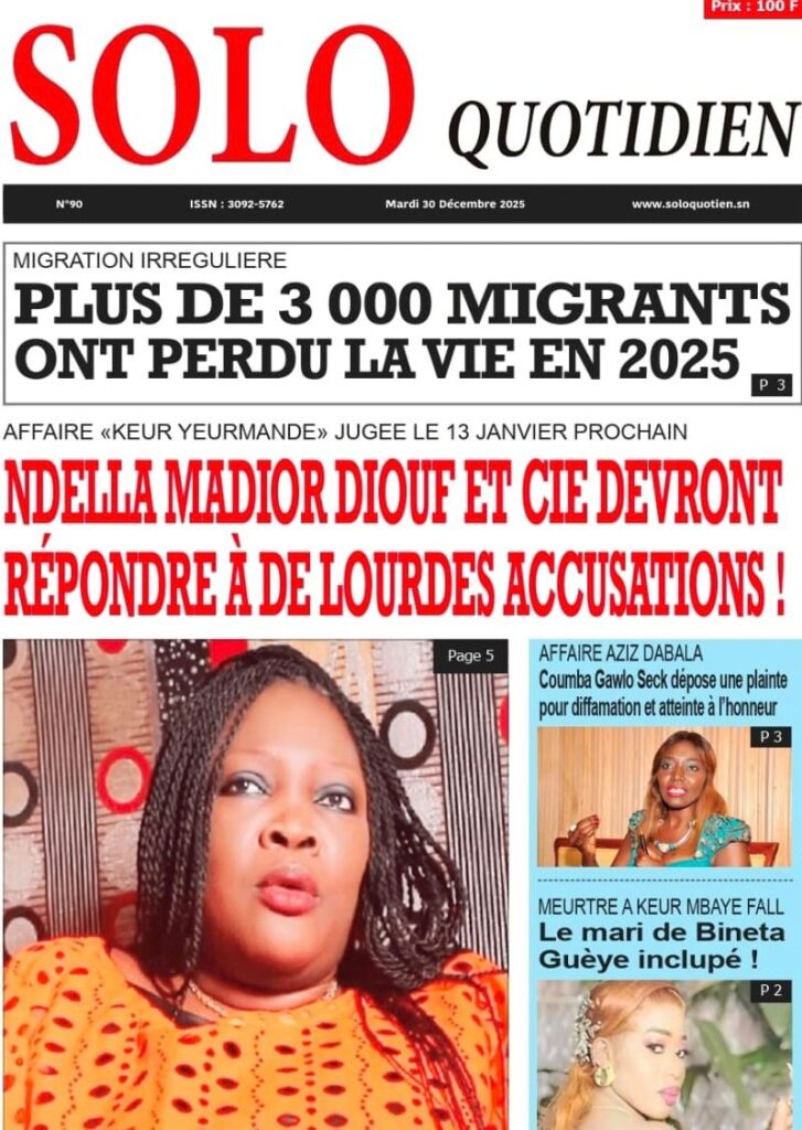 Outre ce drame humanitaire, Solo Quotidien plonge au cœur de l’actualité judiciaire en annonçant une date fatidique pour l’affaire « Keur Yeurmande ». Le journal indique que « Ndella Madior Diouf et Cie devront répondre à de lourdes accusations » lors de leur jugement prévu le 13 janvier prochain. Le quotidien revient également sur les rebondissements de l’affaire Aziz Dabala, notant que la diva Coumba Gawlo Seck a déposé une plainte pour « diffamation et atteinte à l’honneur ». Enfin, sur le registre des faits divers tragiques.