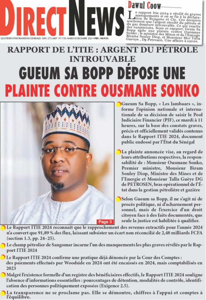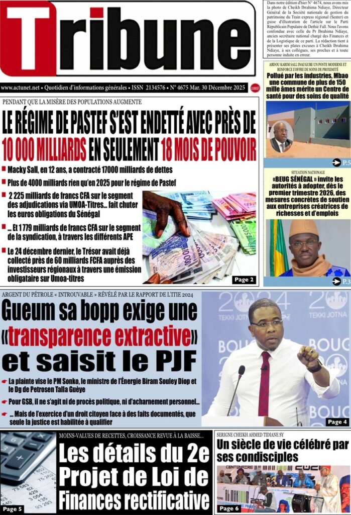 Cette tension économique se double d’une polémique sur la transparence. Direct News et Source A rapportent que le mouvement « Gueum Sa Bopp » a décidé d’activer le Pool Judiciaire Financier (PJF). Selon ces journaux, une plainte vise directement le Premier ministre Ousmane Sonko et d’autres responsables concernant l’argent du pétrole jugé « introuvable » suite au rapport ITIE 2024. Tribune renchérit sur la gestion globale, affirmant que le régime s’est endetté de près de 10 000 milliards en seulement 18 mois.