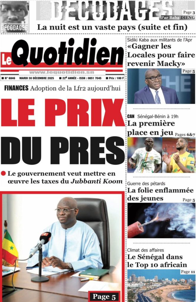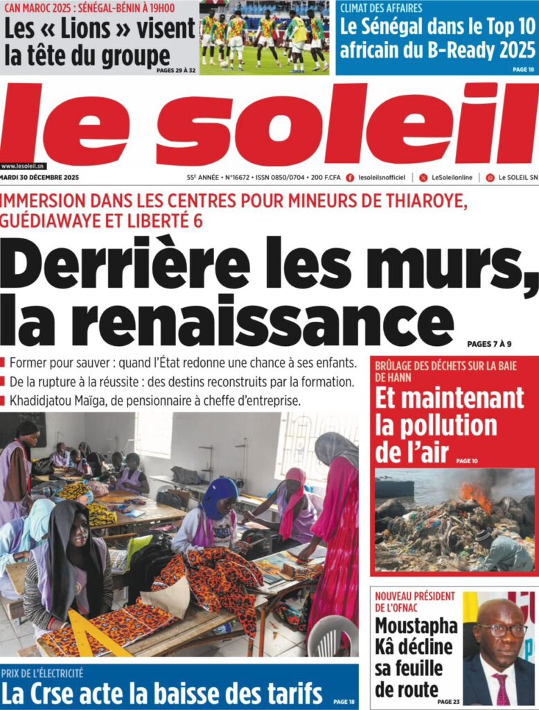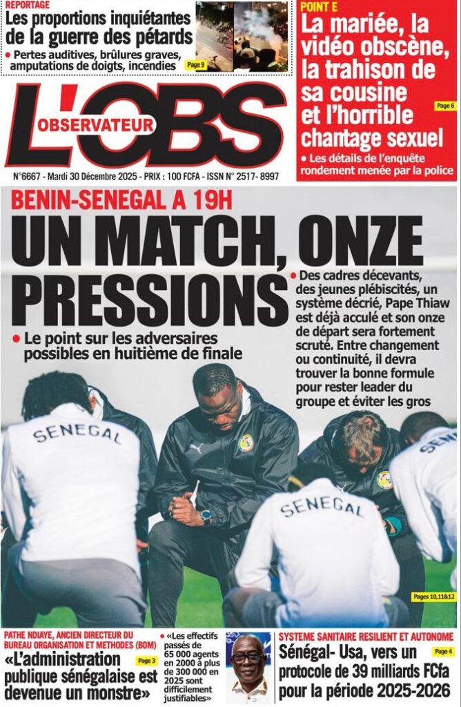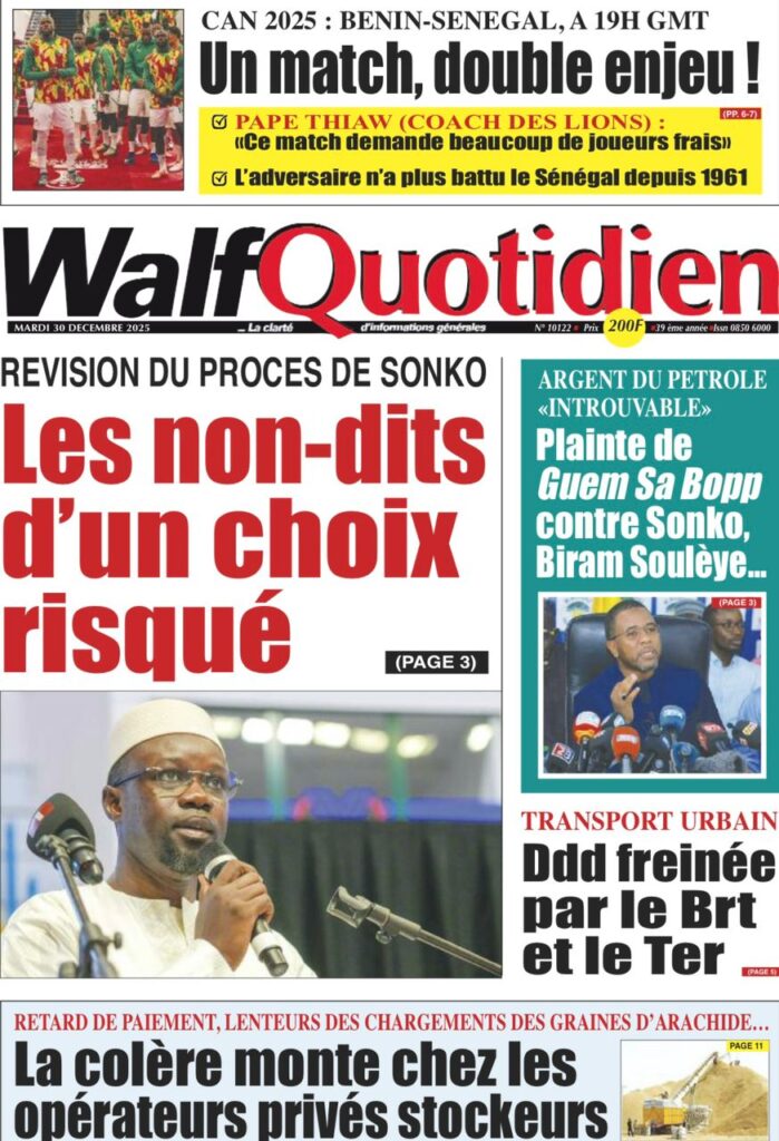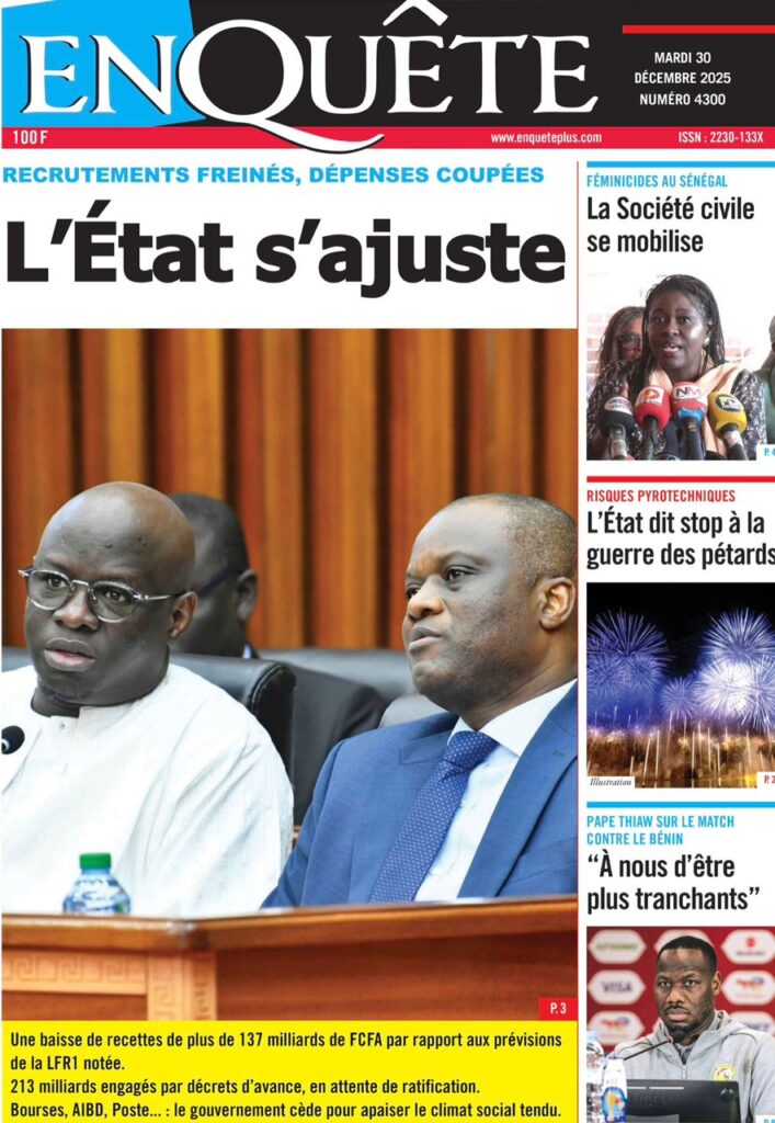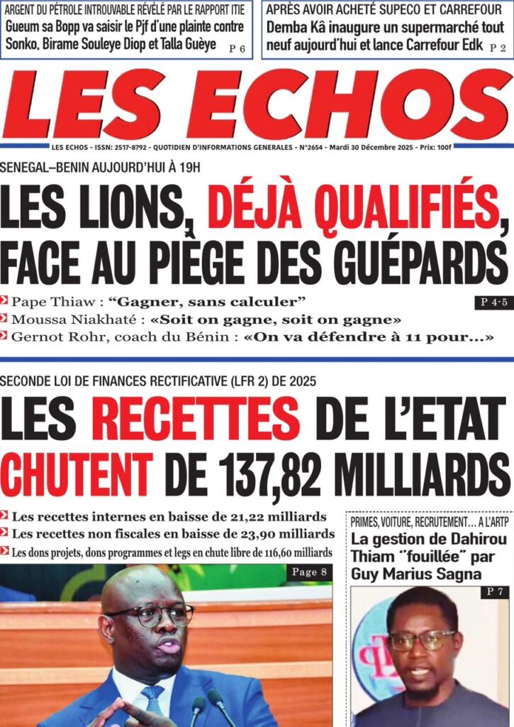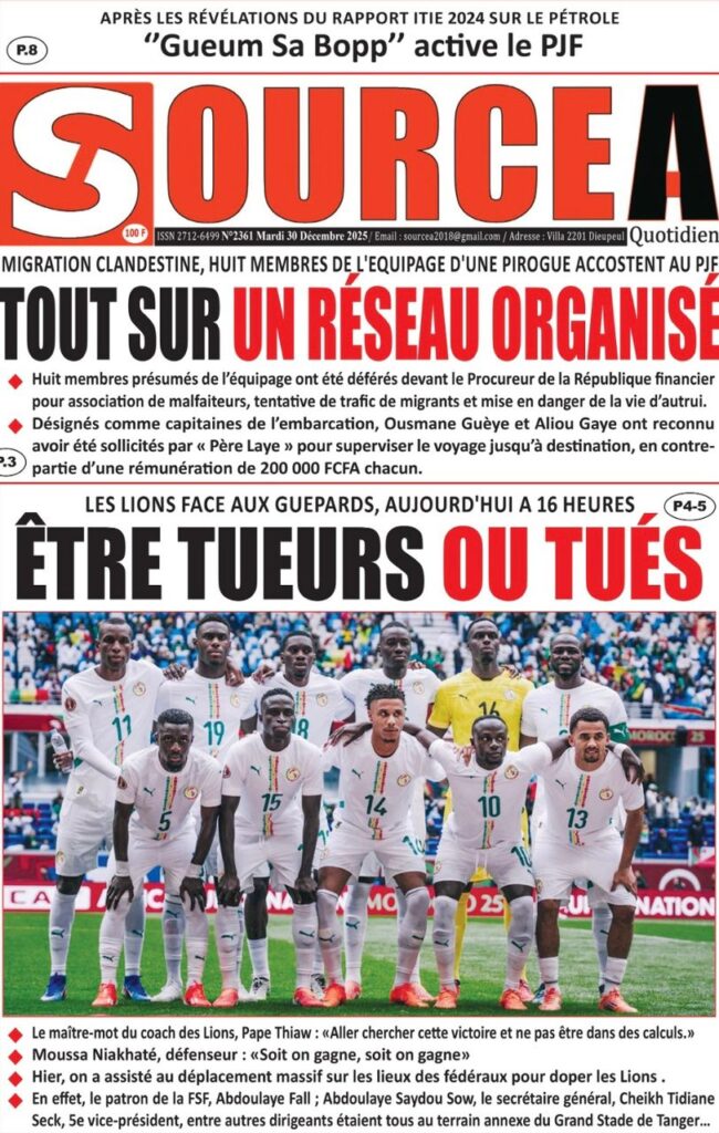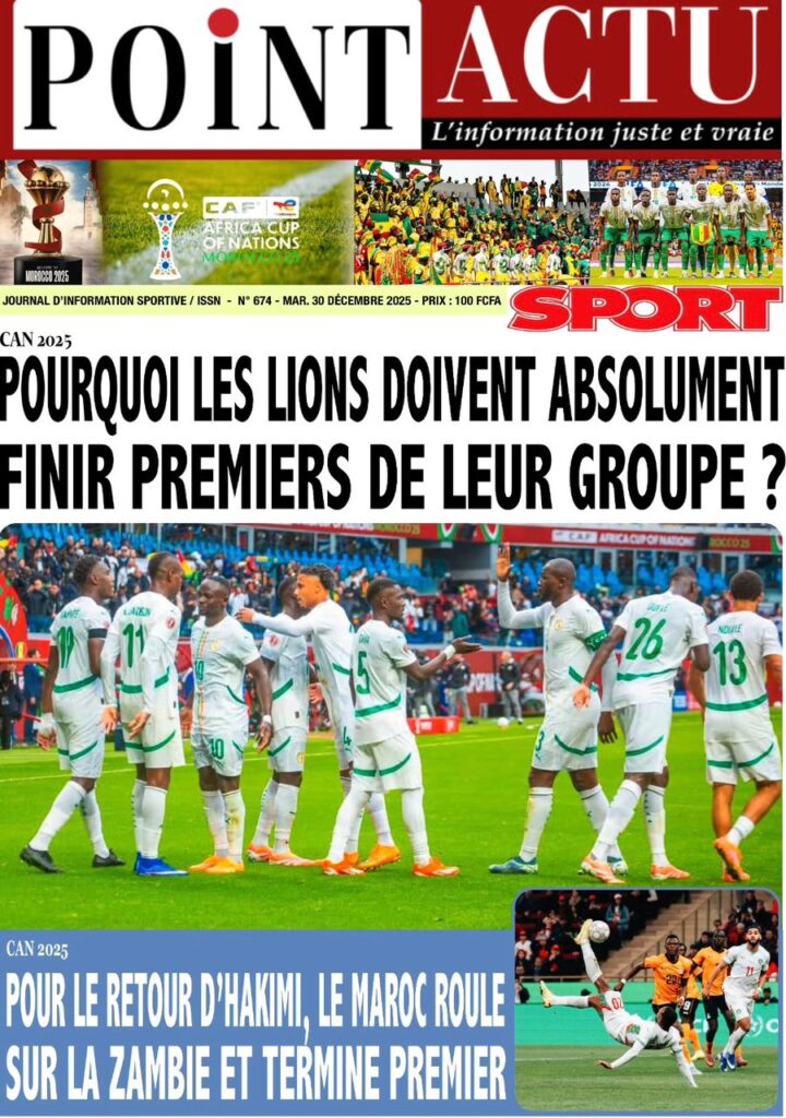 Ce mardi 30 décembre 2025, la presse sénégalaise oscille entre l’espoir suscité par les Lions à la CAN marocaine et l’inquiétude grandissante face à la conjoncture économique et sécuritaire nationale. Alors que le onze national joue sa suprématie continentale à Tanger, l’État fait face à une chute vertigineuse de ses recettes, tandis que la société civile s’alarme d’une fin d’année sous haute tension sociale et judiciaire.