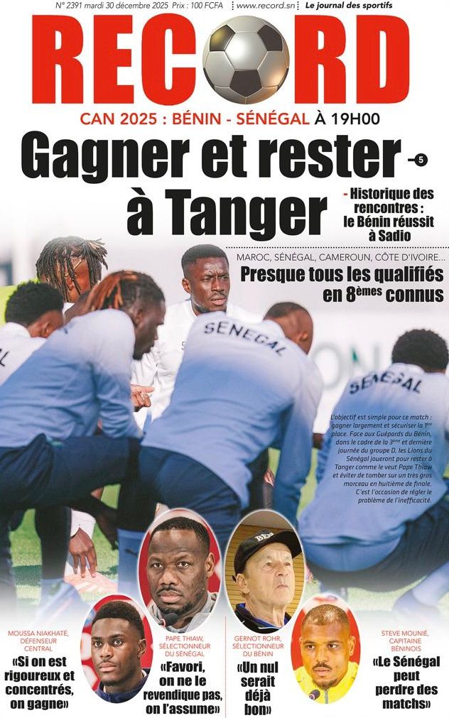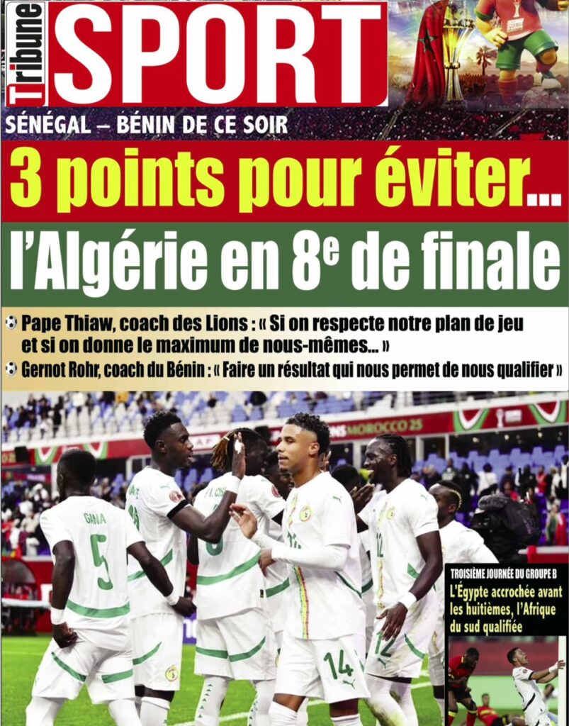 Sur le terrain sportif, l’attention de tout un peuple se tourne vers le Maroc où l’équipe nationale affronte le Bénin. Comme le clame haut et fort le journal Record, l’objectif dépasse le simple cadre comptable : il faut « Gagner et rester à Tanger ». Pour le quotidien sportif, l’enjeu est stratégique : éviter de croiser un gros calibre comme l’Algérie dès les huitièmes de finale et s’épargner un déménagement logistique fastidieux. Cependant, Les Échos tempèrent cet enthousiasme en avertissant les Lions face au « piège des Guépards », rappelant que le Bénin a souvent réussi face au Sénégal.