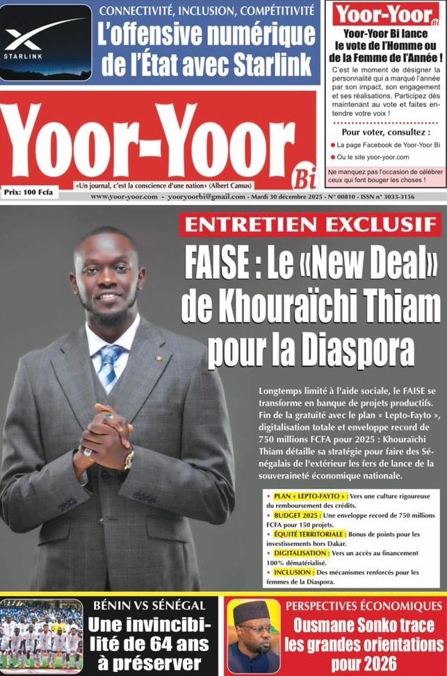 Dans ce climat morose, une lueur d’optimisme émane des pages de Yoor-Yoor Bi. Le journal met en avant un « New Deal » pour la diaspora porté par le FAISE, avec une enveloppe record de 750 millions FCFA pour transformer l’aide sociale en projets productifs. Par ailleurs, le quotidien souligne l’offensive numérique de l’État avec l’arrivée de la technologie Starlink, promettant de désenclaver numériquement le pays.