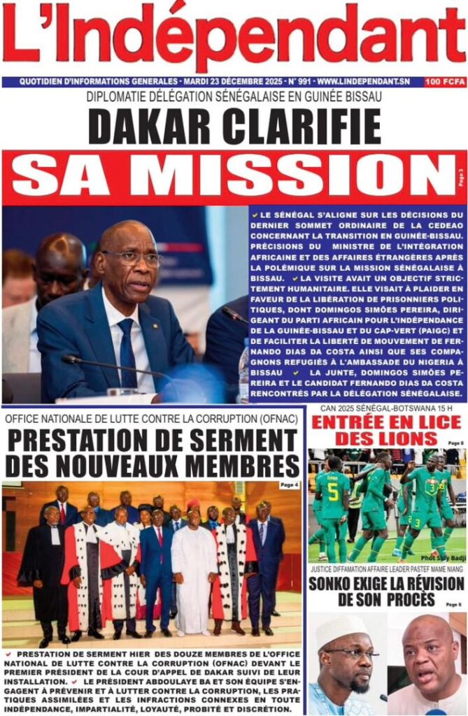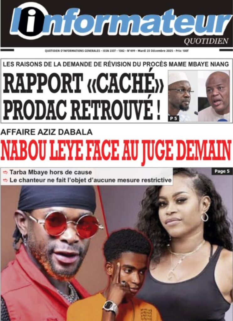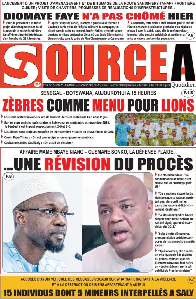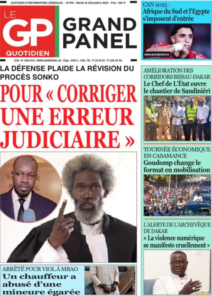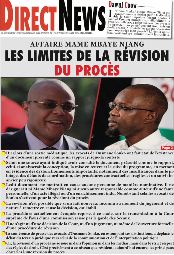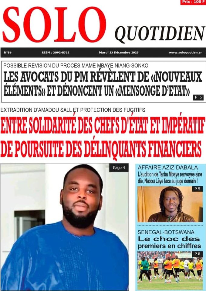 L’actualité de ce mardi 23 décembre 2025 s’ouvre sur un dossier explosif qui fait la Une de SOLO Quotidien qui nous plonge dans les méandres du dossier judiciaire d’Amadou Sall, fils de l’ancien président Macky Sall éxilé au Maroc. Le journal Sud Quotidien qualifie de « séisme judiciaire » la demande de révision du procès opposant le Premier ministre Ousmane Sonko à Mame Mbaye Niang. Selon mon confrère de L’AS, cette procédure inédite, qui a reçu un avis favorable de la commission de la Cour suprême, pourrait totalement rebattre les cartes politiques. Le journal Yor Yor revient sur les fondements de cette requête, précisant que la défense s’appuie sur des faits nouveaux qui auraient été jusque-là occultés, transformant ce dossier en une priorité absolue pour les acteurs du droit.