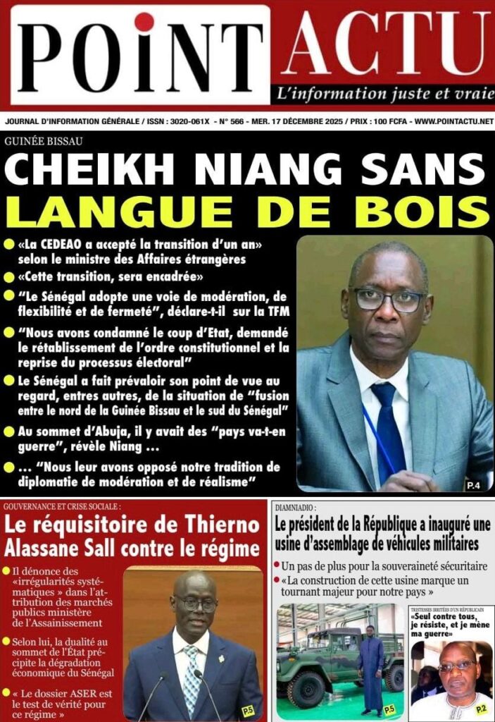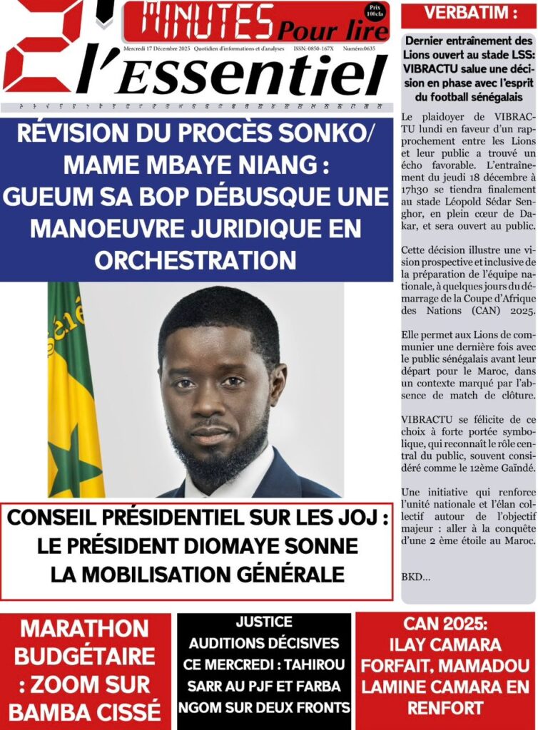 Le Sénégal s’est réveillé ce mercredi 17 décembre 2025 sous le signe d’une avancée technologique majeure qui fait la Une de la quasi-totalité de la presse nationale. En effet, le quotidien national Le Soleil affiche fièrement à sa Une que « le Sénégal franchit la ligne de front » avec l’inauguration par le président Bassirou Diomaye Faye de la première unité de montage de véhicules militaires à Diamniadio. Selon mon confrère du journal L’Observateur, cet événement marque une étape décisive, le chef de l’État posant ainsi les jalons d’une véritable souveraineté industrielle et technologique. Le journal Solo, quant à lui, met en avant l’aspect inédit de cette usine de moteurs militaires, tout en relayant une confidence politique de taille du président qui prie pour que son Premier ministre, Ousmane Sonko, soit son futur successeur.
