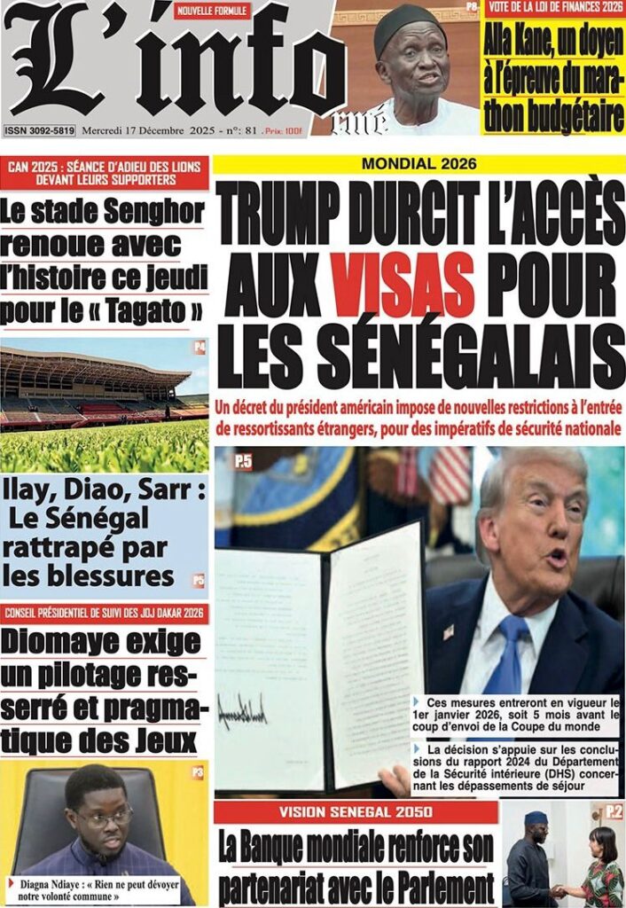 Sur le plan social et sanitaire, l’inquiétude grandit. Le journal L’Observateur lève le voile sur ce qu’il appelle le « scandale continu » des serviettes hygiéniques SoftCare, révélant que malgré des alertes sur la dangerosité de ces produits, ils circulent encore dans le commerce. Les journaux Enquête et L’Info ont aussi abordé la situation alarmante des pêcheurs sénégalais à Nouadhibou, parlant d’une véritable « chasse aux Sénégalais » en Mauritanie, marquée par des rafles et des actes de violence. Parallèlement, le quotidien Le Point revient sur les mesures restrictives de l’administration Trump concernant l’octroi de visas aux Sénégalais pour des raisons de sécurité nationale.