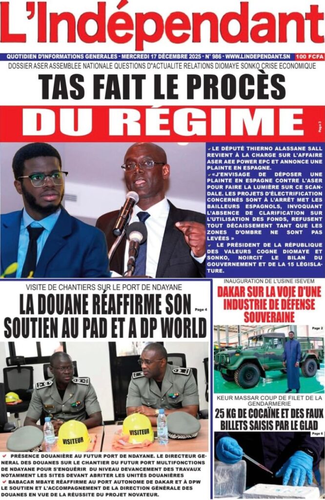 Toutefois, cette actualité industrielle n’éclipse pas les tensions politiques qui animent la cité. Le quotidien Les Échos rapporte les propos acerbes de Thierno Alassane Sall qui qualifie la gouvernance actuelle de « plus grosse duperie du siècle ». Mon confrère du journal Rewmi précise d’ailleurs que le leader de la « République des Valeurs » n’exclut pas de porter l’affaire ASER devant les juridictions espagnoles, jugeant inacceptable l’implication de la Cour suprême dans ce dossier. Le journal Tribune, quant à lui, s’inquiète des difficultés financières du pays en soulignant que le Sénégal peine à lever 90 milliards sur le marché financier de l’UEMOA, ne récoltant que 30 milliards malgré des taux d’intérêt élevés, ce qui témoigne d’une certaine frilosité des investisseurs.