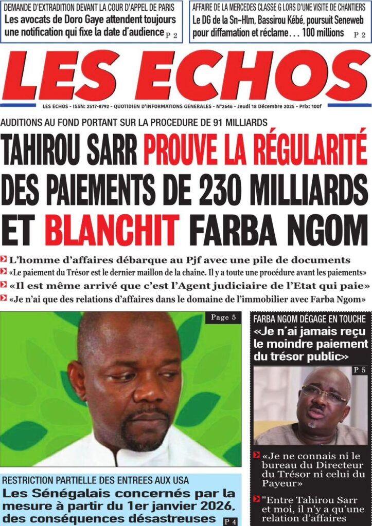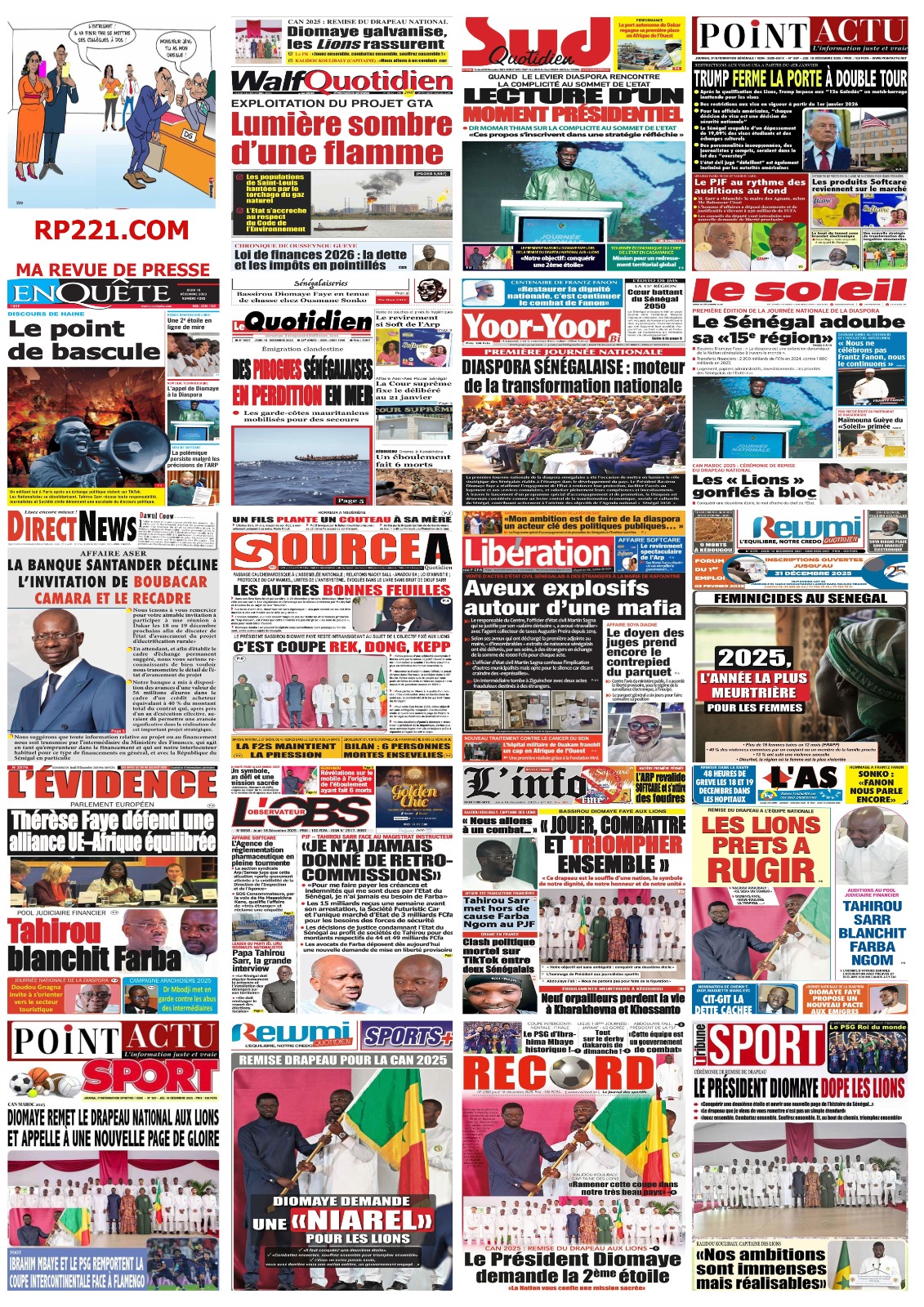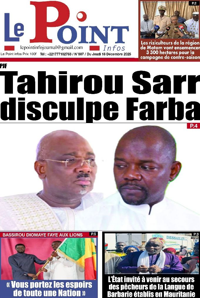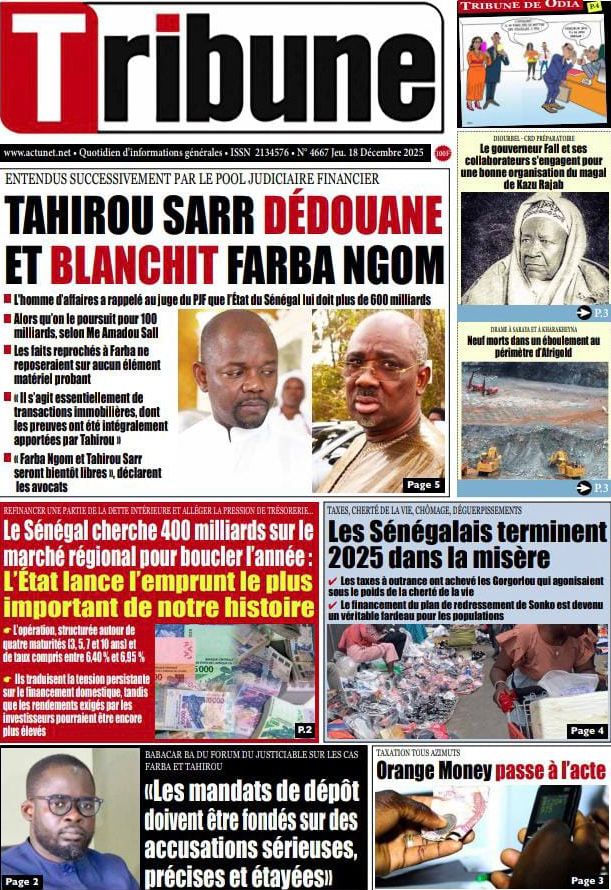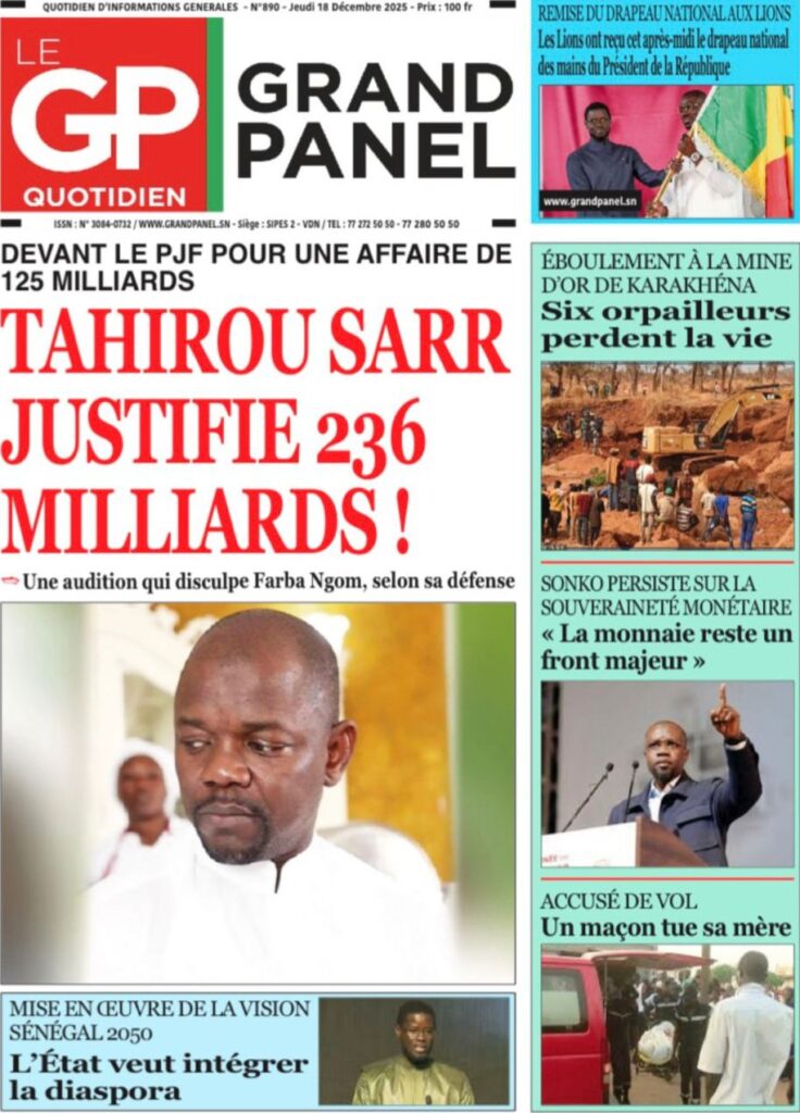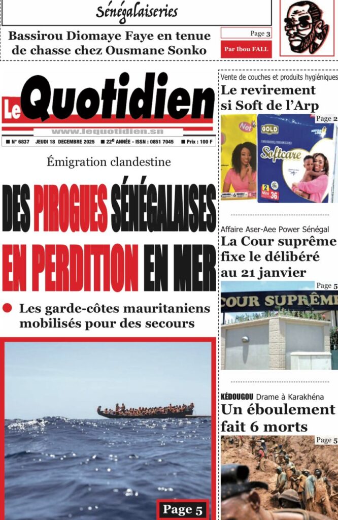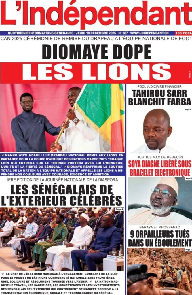 Sur le terrain du sport et de l’émotion nationale, la ferveur monte à l’approche de la CAN 2025. Le journal Source A titre avec audace les propos du Chef de l’État lors de la remise du drapeau aux Lions : « C’est Coupe rek, dong, kepp ! ». Mes confrères de Walf Quotidien et de L’info rapportent en chœur ce cri de ralliement présidentiel : « Jouez ensemble, combattez ensemble, souffrez ensemble ! ». Le quotidien Vox Pop, quant à lui, revient sur cette quête d’une deuxième étoile qui fait déjà vibrer tout le Sénégal, alors que nos Lions s’envolent pour le Maroc avec la lourde mission de ramener le trophée à Dakar. Côté justice et faits divers, les dossiers brûlants ne manquent pas. Le journal Vox Pop nous informe d’un rebondissement dans l’affaire Tahirou Sarr et Farba Ngom, où l’homme d’affaires aurait « blanchi » le responsable politique devant les enquêteurs en justifiant les 236 milliards en cause. « L’info », pour sa part, nous plonge dans la tristesse avec le drame survenu à Kharakhena, dans la région de Kédougou, où un éboulement sur un site d’orpaillage a coûté la vie à au moins neuf de nos compatriotes. Enfin, le quotidien Rewmi nous livre un constat glaçant sur la sécurité des femmes, qualifiant 2025 d’année la plus meurtrière avec plus de 15 féminicides recensés