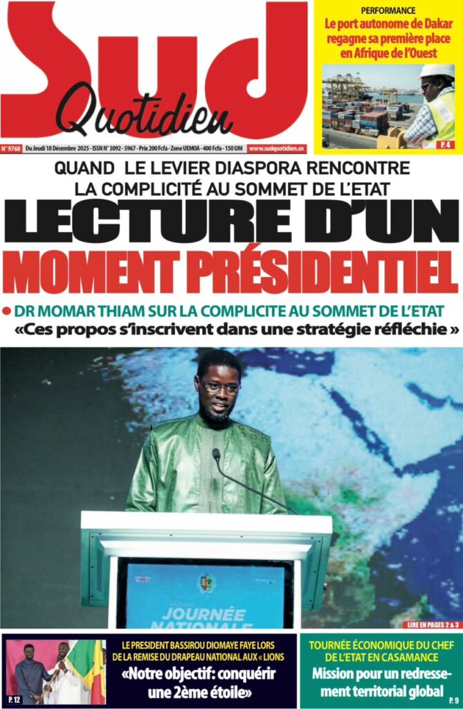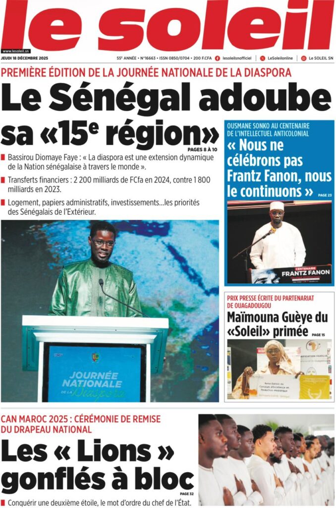 Le quotidien national Le Soleil ouvre le bal en nous apprenant que la diaspora est désormais officiellement considérée comme la « 15ème région » du pays, avec un apport financier colossal estimé à 2 200 milliards de FCFA pour l’année 2024. Selon mon confrère de Sud Quotidien, ce fut un véritable « Moment présidentiel » où le Chef de l’État a su galvaniser les troupes pour faire de cette force vive un levier stratégique du développement national. Dans la même veine, mon collègue du journal EnQuête souligne le « New Deal » technologique proposé par le président, appelant les cerveaux expatriés à revenir porter la transformation numérique du Sénégal.