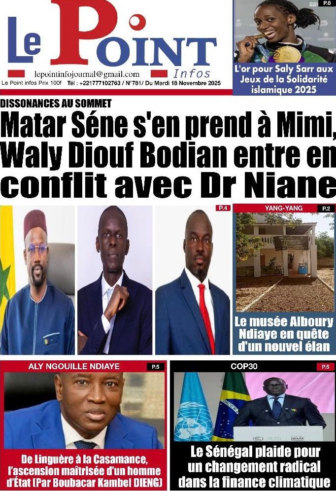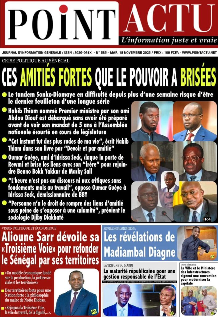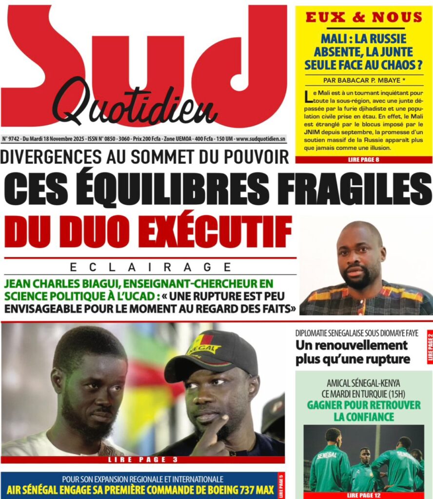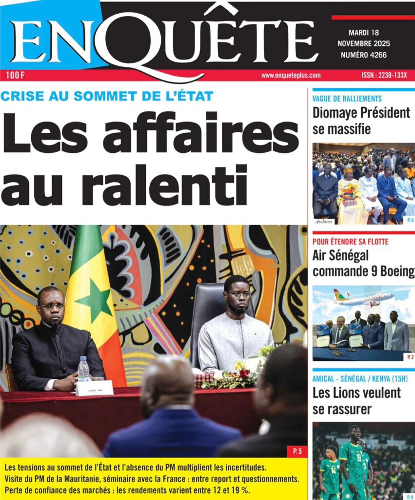 Ce mardi 18 novembre 2025, la presse sénégalaise reflète un pays traversé par de profondes turbulences politiques, des défis économiques majeurs et l’espoir renaissant autour de ses Lions du football. Le fil rouge qui relie presque tous les quotidiens est la crise au sommet de l’État, exacerbée par les tensions au sein de l’ancienne coalition victorieuse.