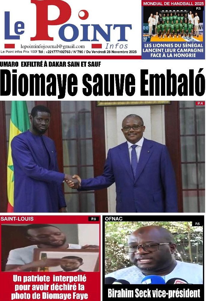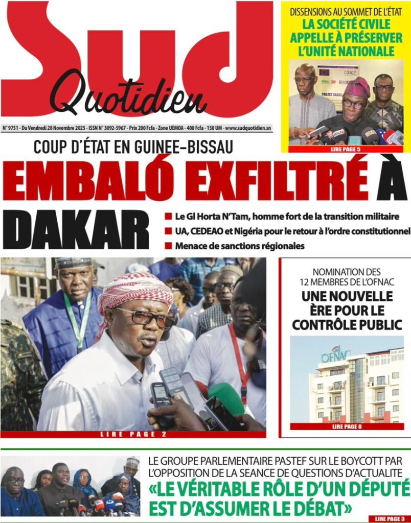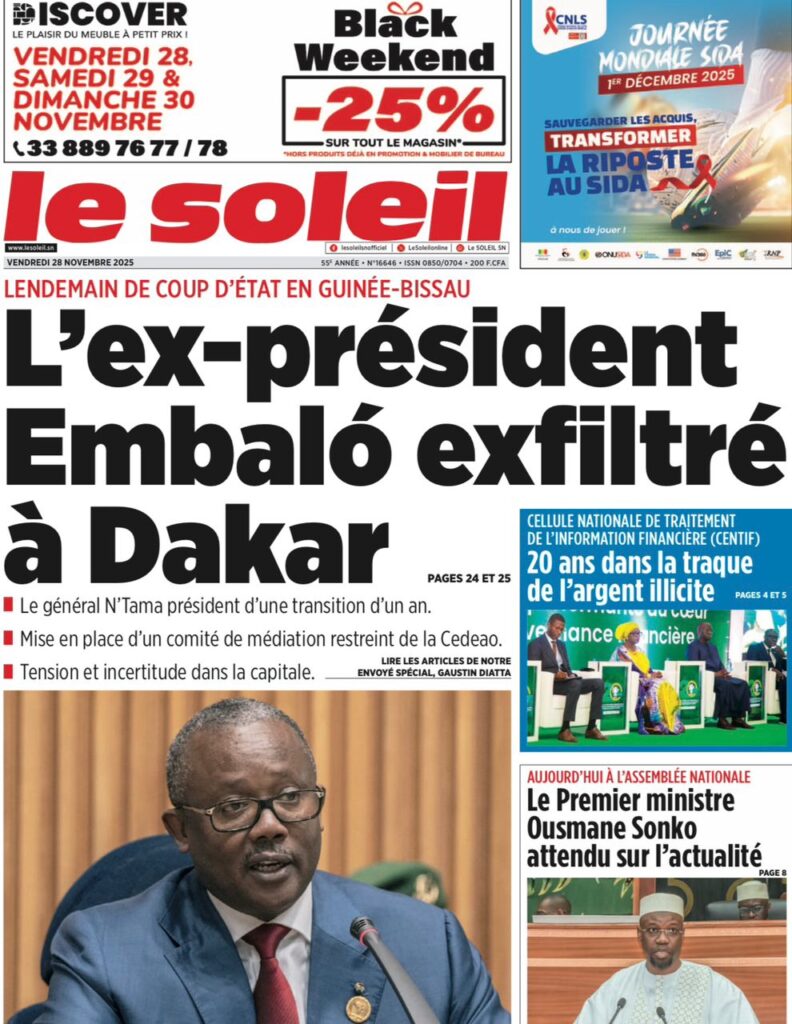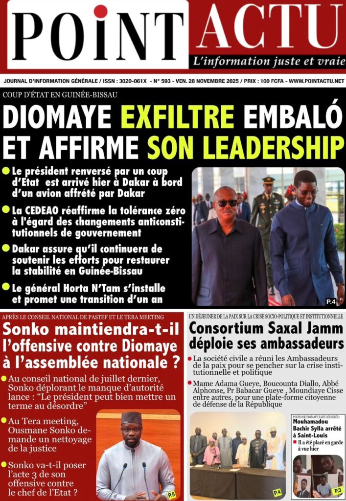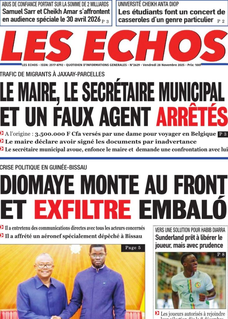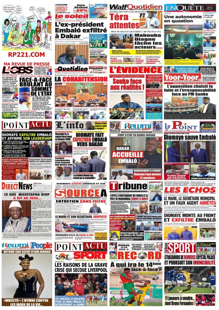 L’événement majeur, largement relayé en une, est sans conteste l’exfiltration de l’ex-président bissau-guinéen Umaro Sissoco Embaló vers Dakar suite au coup d’État militaire qui a secoué Bissau ; Le Point titre sobrement « Diomaye sauve Embaló« , tandis que L’Info et Point Actu insistent sur le leadership affirmé du Sénégal dans cette crise, précisant que le chef de l’État a affrété un avion pour mettre son homologue déchu en sécurité, un geste de fermeté salué par Les Echos qui évoque Diomaye montant au front. Sud Quotidien et Le Soleil apportent des précisions sur le général N’Tam, l’homme fort de la transition d’un an, et rappellent la menace de sanctions planant sur Bissau de la part de la CEDEAO, ce que Rewmi Quotidien résume d’un simple « Dakar accueille Embaló« .