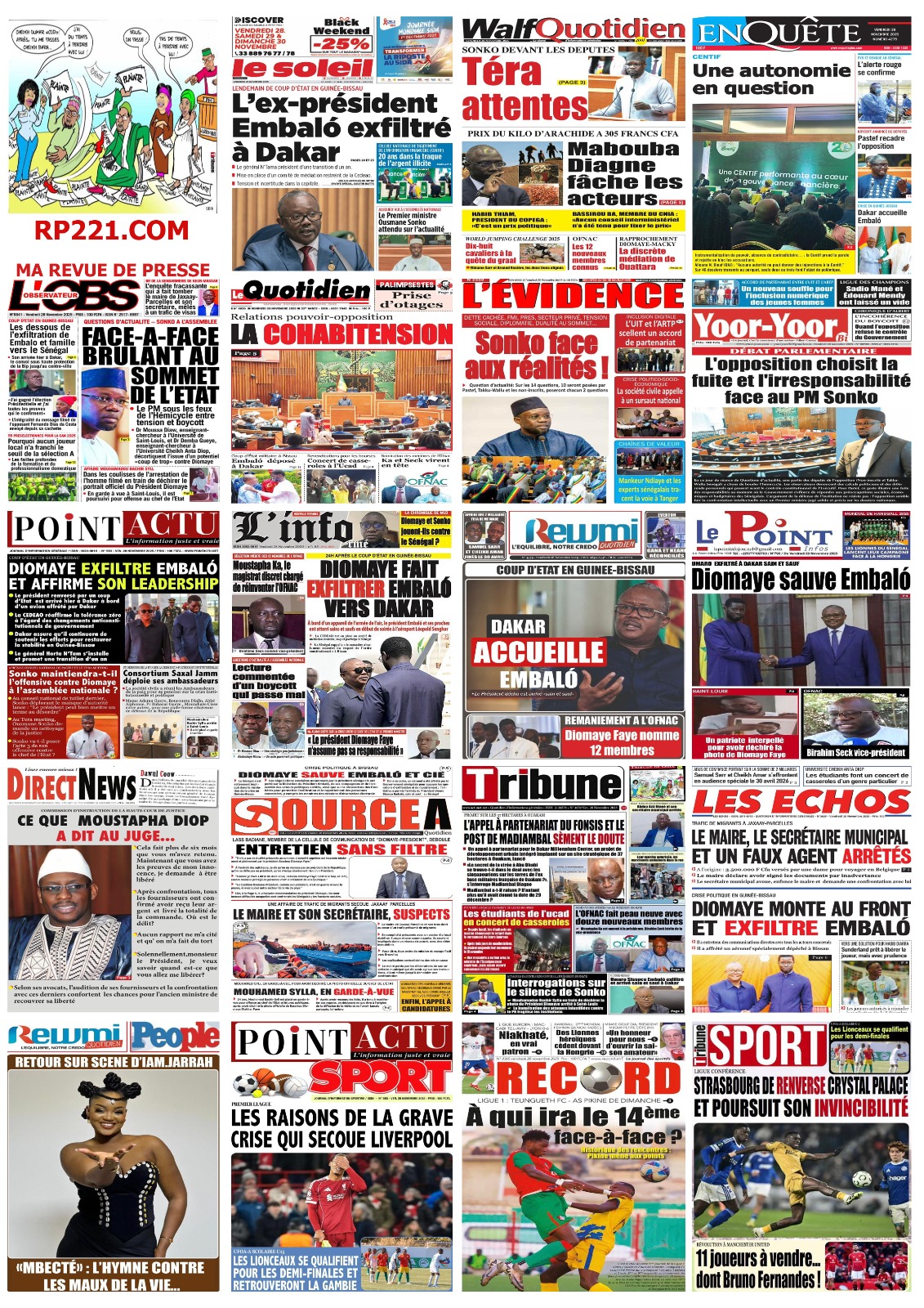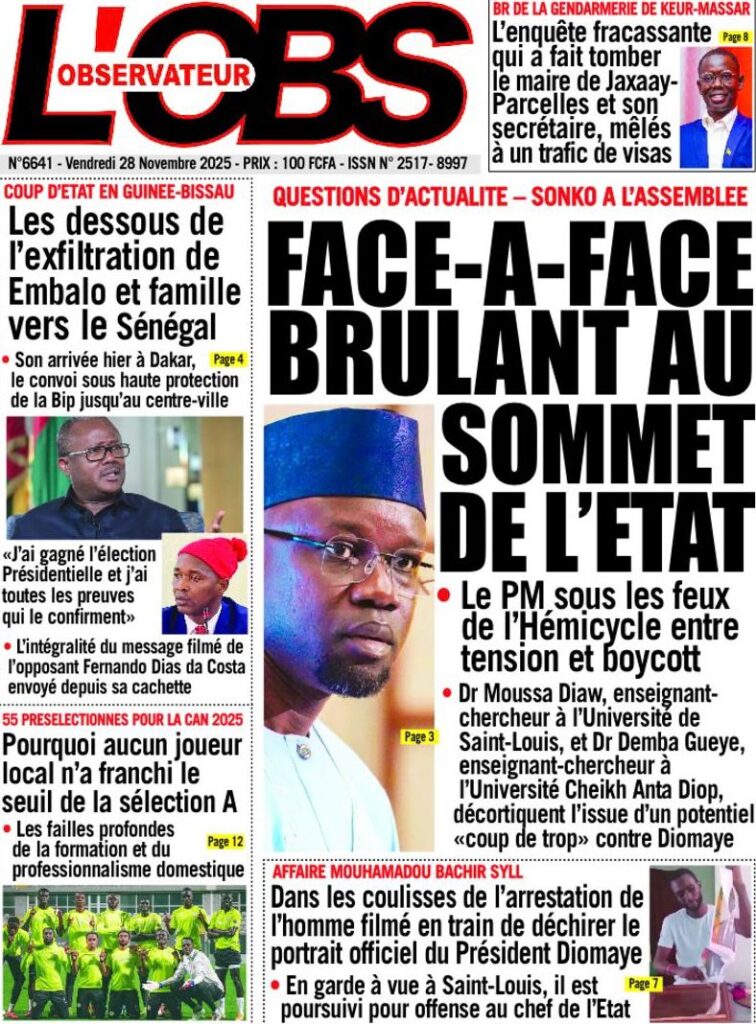 C’est un cocktail détonant d’actualités politiques, diplomatiques et institutionnelles qui inonde les kiosques ce vendredi 28 novembre, où la crise en Guinée-Bissau et la tension politique intérieure au Sénégal se disputent l’espace médiatique. Les quotidiens, Le Soleil à L’Observateur en passant par Rewmi Quotidien, dressent le portrait d’un pays à la croisée des chemins, assumant son rôle de leader sous la houlette du Président Diomaye Faye.