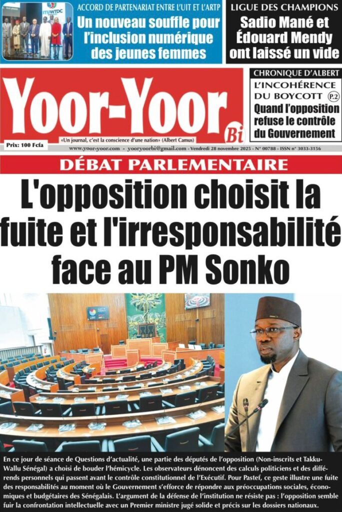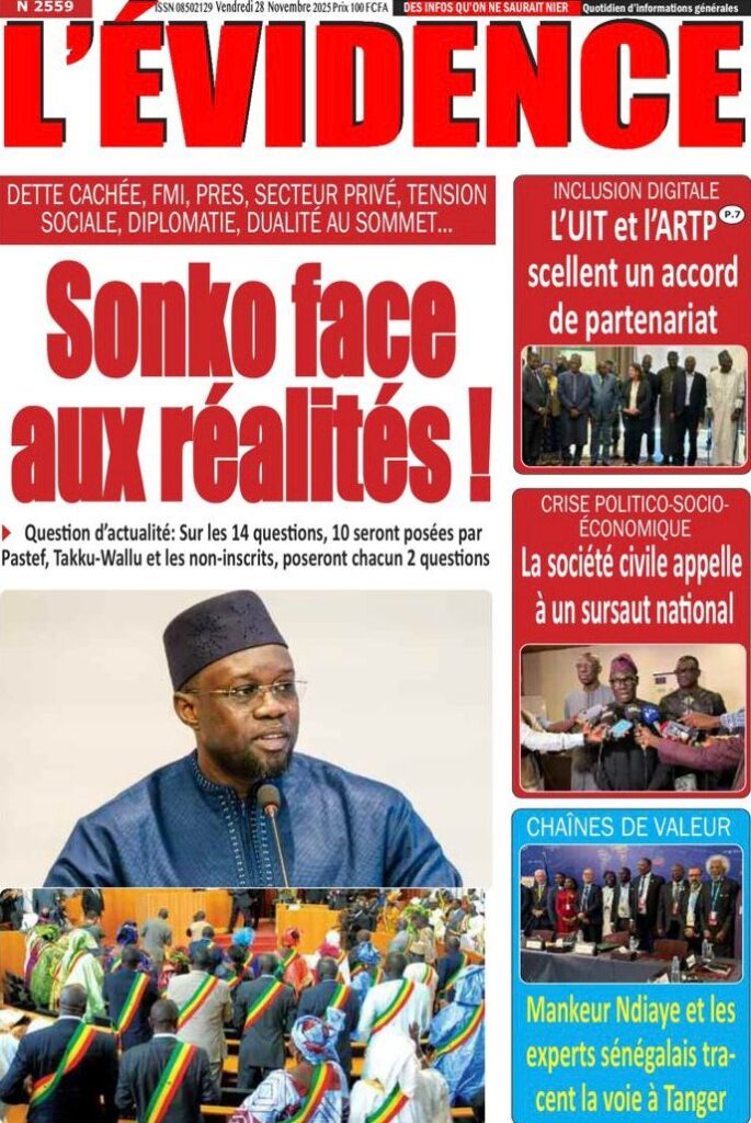 Cette implication diplomatique forte n’éclipse en rien les tensions à l’Assemblée Nationale où le Premier ministre Ousmane Sonko est attendu pour la séance des questions d’actualité, un face-à-face brûlant pour L’Observateur qui rapporte une ambiance de haute tension et de boycott ; d’ailleurs, le journal Yoór-Yoór dénonce l’opposition qui aurait choisi « la fuite et l’irresponsabilité » face à Sonko, une lecture que ne partagent pas certains analystes repris par L’Info qui commente ce boycott qui passe mal, alors que Le Quotidien titre sur « La Cohabitation » illustrant la complexité des relations entre le pouvoir et l’opposition, tandis que L’Évidence met en avant un « Sonko face aux réalités ! » ; dans un autre registre mais toujours lié à la politique interne, Libération et Source A détaillent l’arrestation à Saint-Louis de Mouhamadou Bachir Sylla, en garde-à-vue pour avoir déchiré le portrait officiel du chef de l’État, un acte jugé comme « offense au Chef de l’État et injures publiques » qui rappelle les sensibilités institutionnelles.