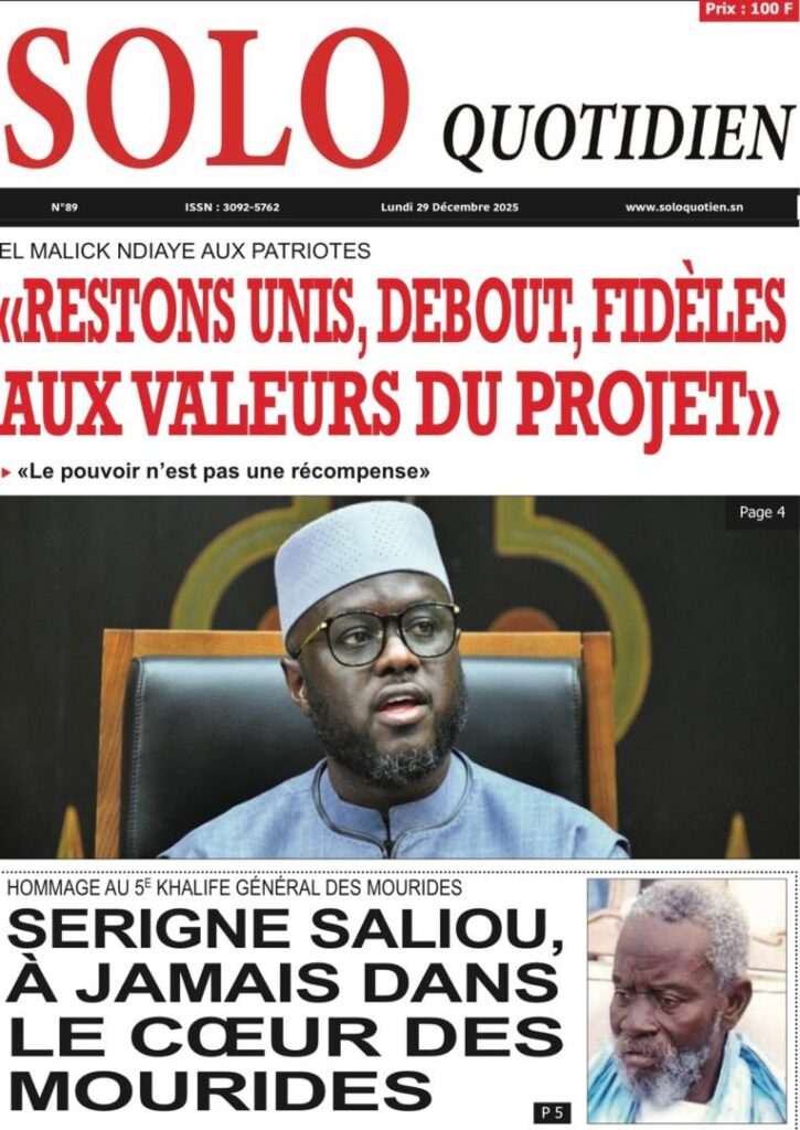 L’actualité de ce lundi s’ouvre sur une note de solennité et de rappel aux valeurs fondamentales du « Projet », une tonalité donnée par Solo Quotidien qui met en exergue la sortie du Président de l’Assemblée nationale. Selon le journal, El Malick Ndiaye siffle la fin de la récréation en martelant que « le pouvoir n’est pas une récompense », invitant les Patriotes à rester « unis, debout et fidèles ». Cette posture de responsabilité est relayée par mon confrère de L’Evidence, qui souligne comment El Malick Ndiaye « plaide pour la responsabilité et le rassemblement » au moment où des voix dissonantes se font entendre. Ce besoin d’ordre politique trouve un écho brutal chez Rewmi Quotidien, qui nous apprend que le ménage a commencé ailleurs : Déthié Fall a limogé le Secrétaire national du PRP pour ses critiques contre le régime, illustrant une atmosphère où la loyauté partisane est mise à rude épreuve.