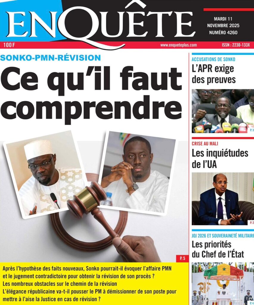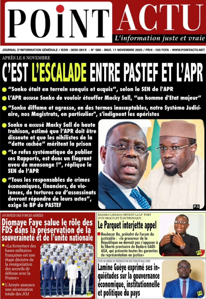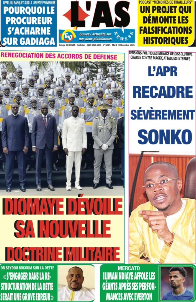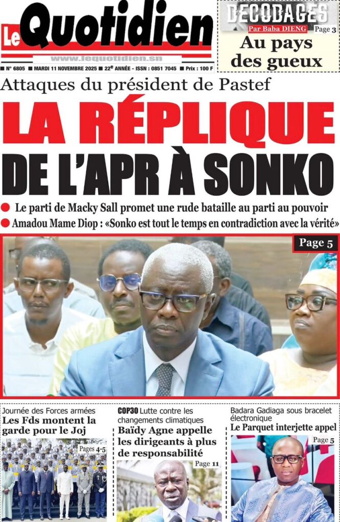 - L’AS et Le Quotidien titrent sur la réaction musclée de l’opposition. Sous le titre « L’APR RECADRE SÉVÈREMENT SONKO » (L’AS), les cadres de l’APR, cités par la presse, dénoncent une manipulation et un « flagrant aveu de mensonge » (Point Actu). Le parti de Macky Sall affirme, selon Le Quotidien, que Sonko est « tout le temps en contradiction avec la vérité ».