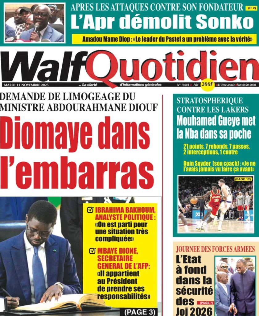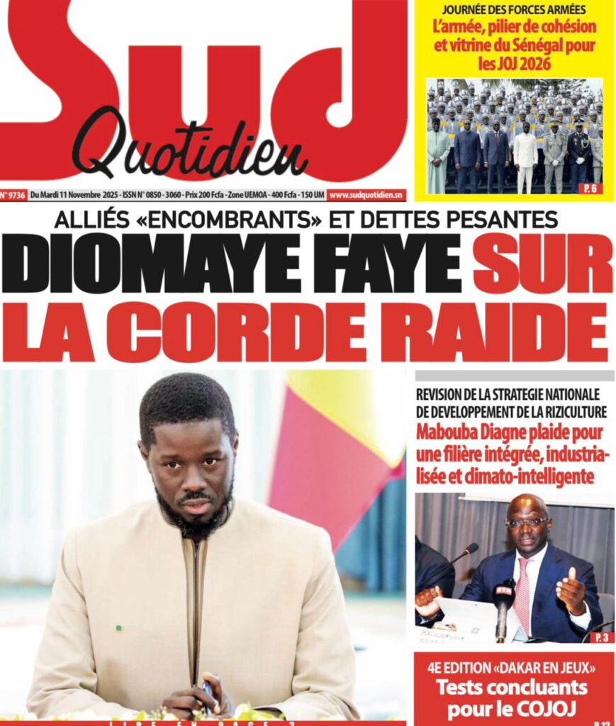- Ces attaques s’inscrivent dans un climat général de pression sur le chef de l’État. Sud Quotidien résume la situation du Président Bassirou Diomaye Faye, le décrivant « SUR LA CORDE RAIDE » face à ses « alliés « encombrants » et dettes pesantes ».