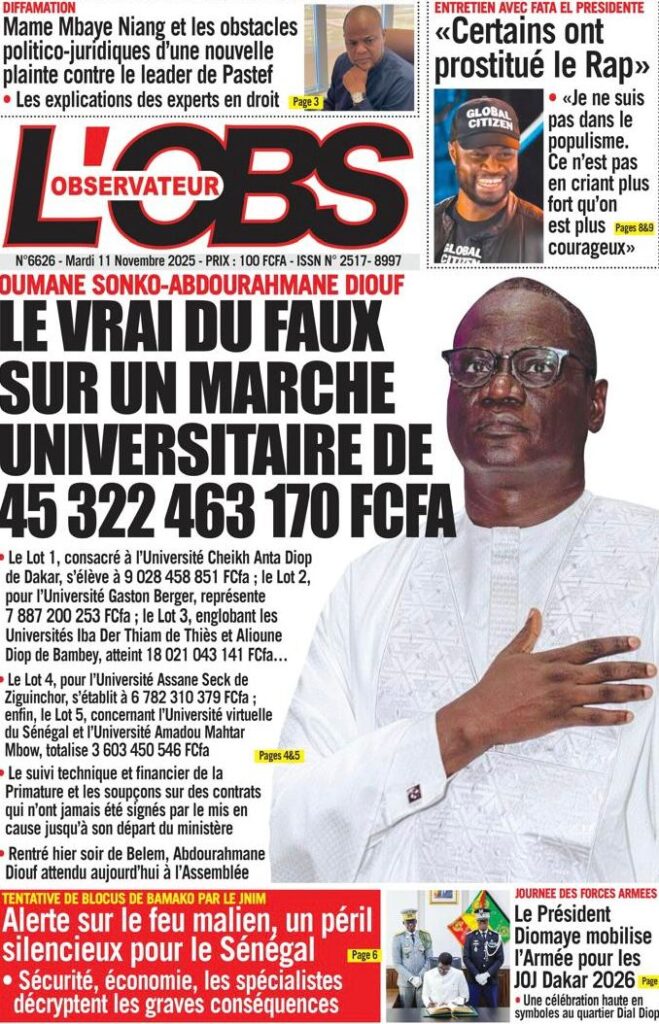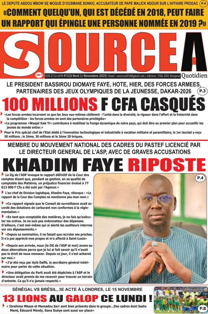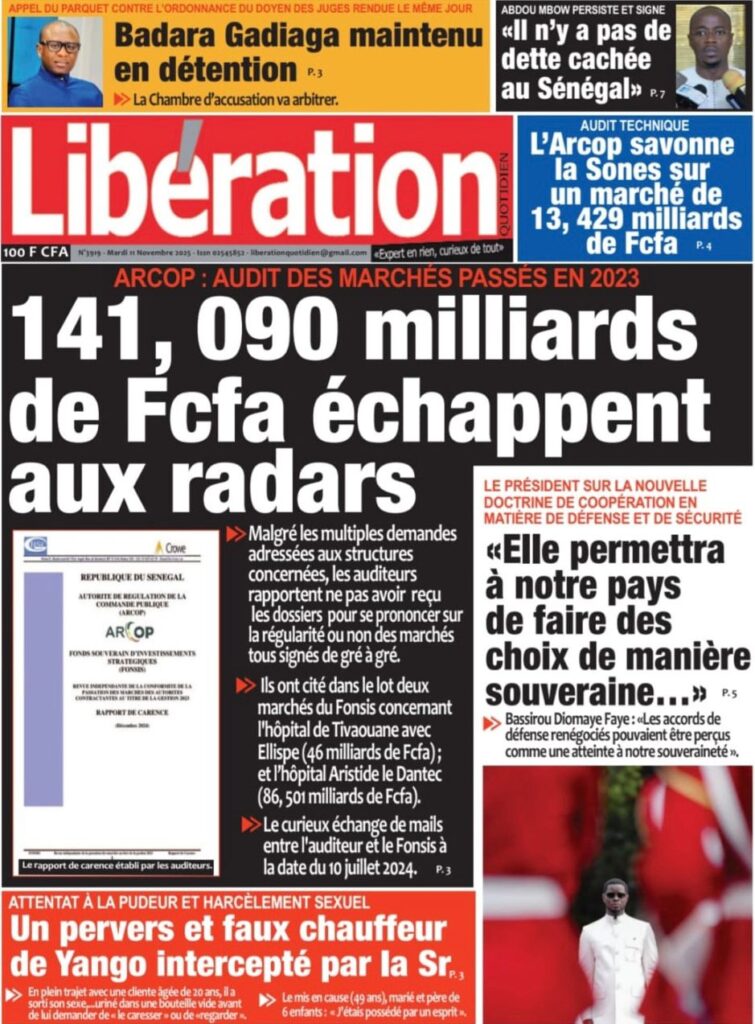 - Parallèlement, l’audit de la gouvernance sous l’ancien régime continue de faire les gros titres. Libération révèle que l’audit de l’ARCOP sur les marchés passés en 2023 montre que « 141,090 MILLIARDS DE FCFA ÉCHAPPENT AUX RADARS », les auditeurs n’ayant pu obtenir les dossiers pour se prononcer sur la régularité des marchés.