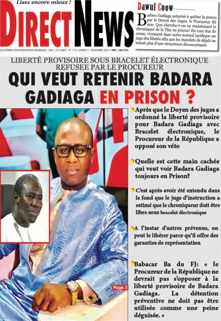 - Direct News s’interroge : « QUI VEUT RETENIR BADARA GADIAGA EN PRISON ? » L’opposition du Parquet, qui maintient le chroniqueur en détention en attendant la décision de la Chambre d’accusation (Libération), est perçue par certains avocats comme une instrumentalisation de la détention préventive.