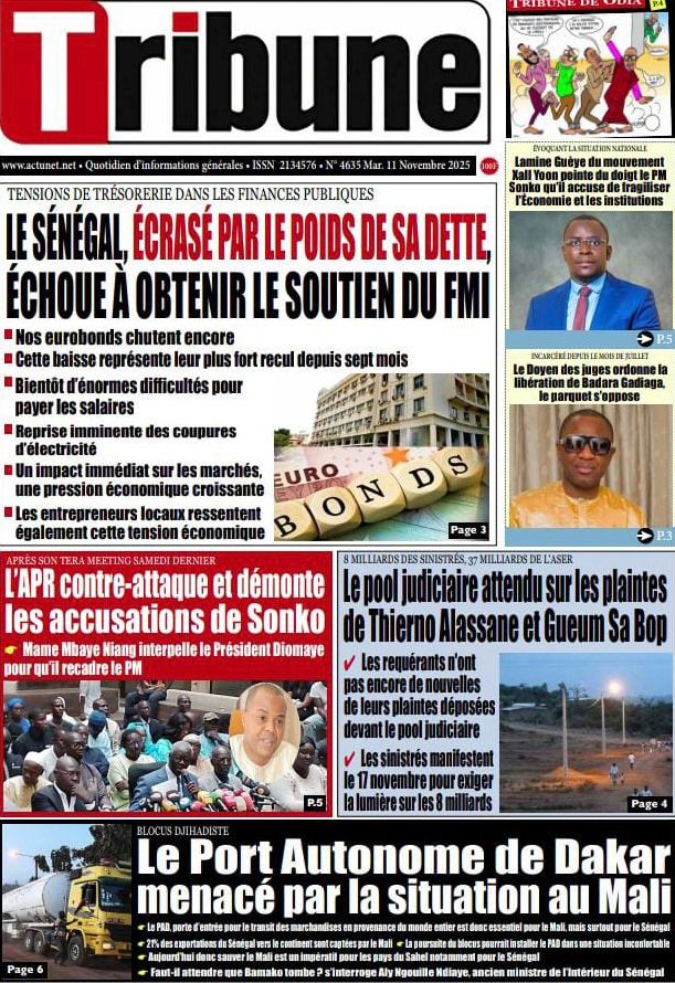 - Tribune fait état d’un échec des négociations, titrant : « LE SÉNÉGAL, ÉCRASÉ PAR LE POIDS DE SA DETTE, ÉCHOUE À OBTENIR LE SOUTIEN DU FMI ». Cette nouvelle intervient au moment où Les Echos signale une « BAISSE RECORD DES EURO-OBLIGATIONS DU SÉNÉGAL ».